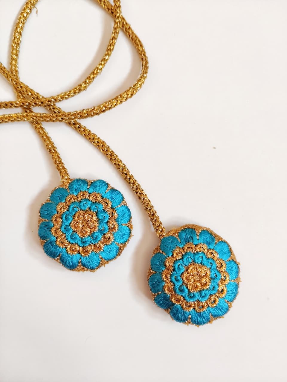 Readymade Tassel with Sky Blue color silk thread and Golden Zari thread Embroidery