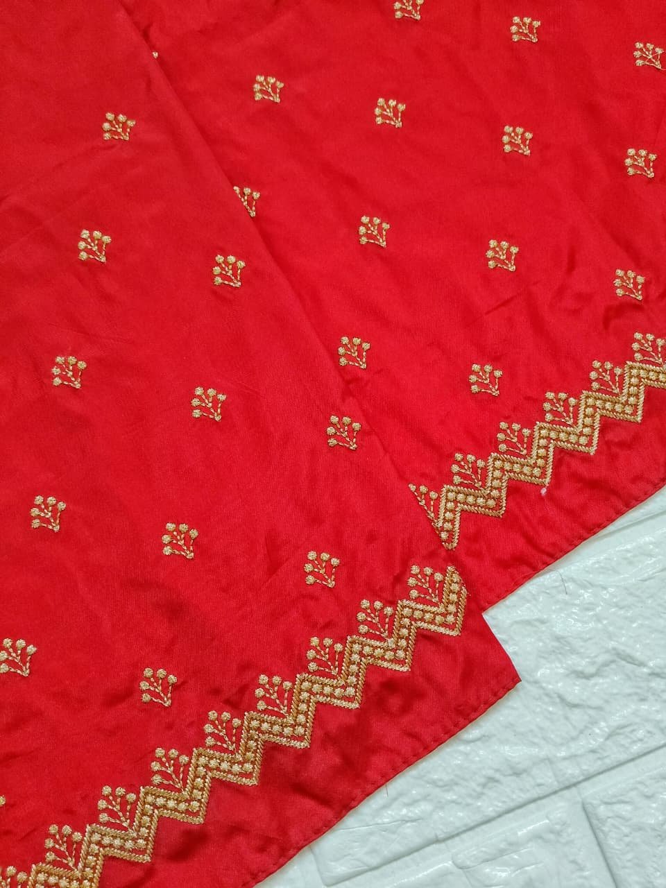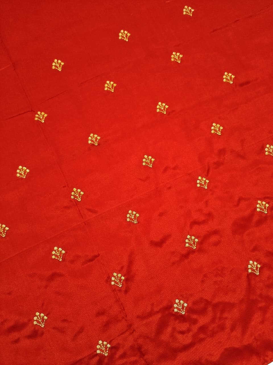Red Color Fabric with Golden Zari Embroidery Work on Sleeves and simple buttas on the Back side