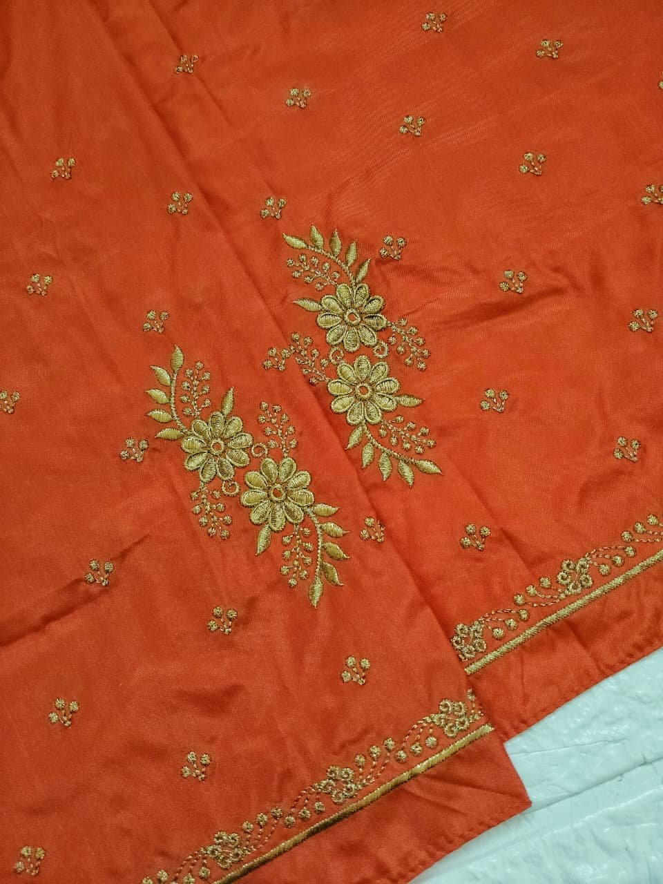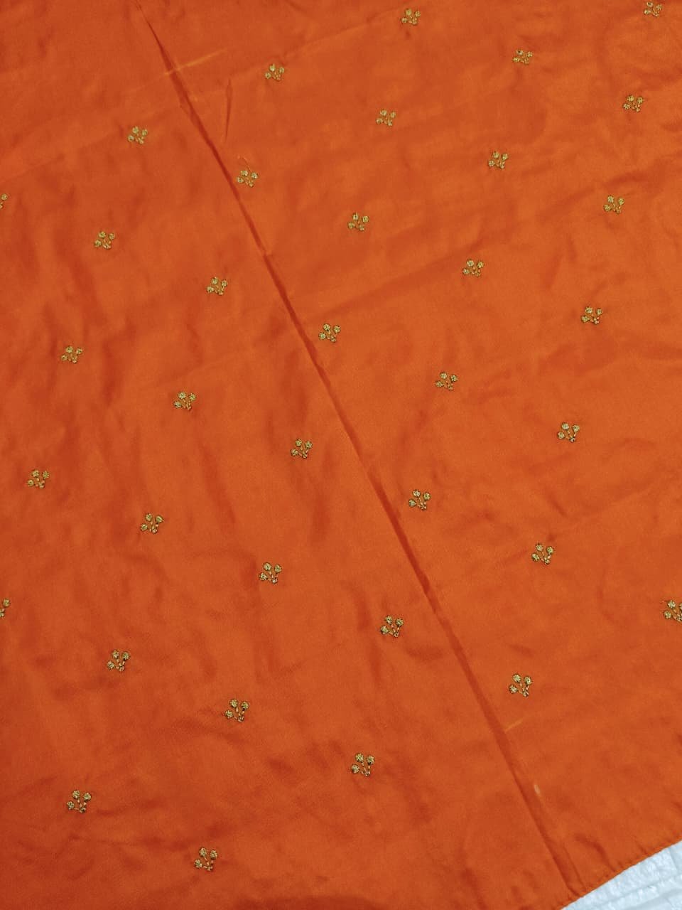 Orange Color Fabric with Golden Zari Embroidery Work on Sleeves and simple buttas on the Back side