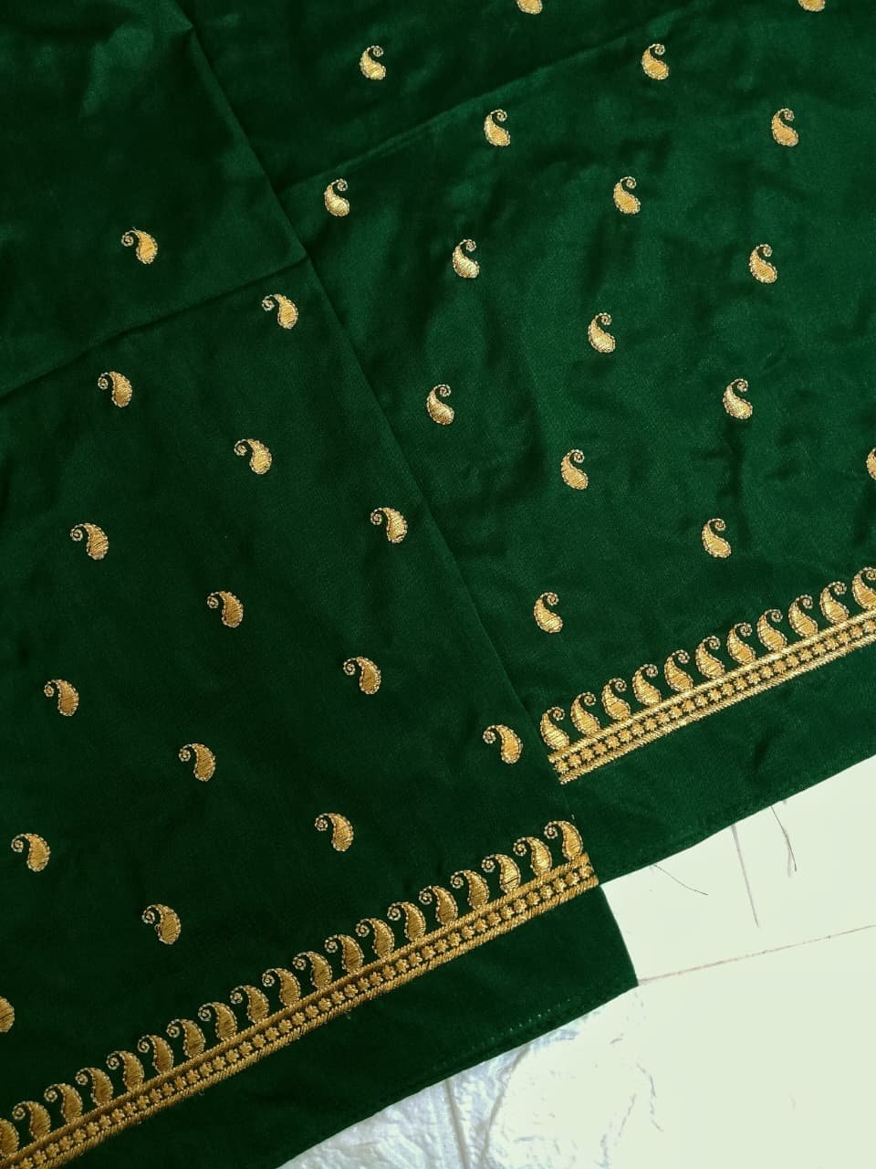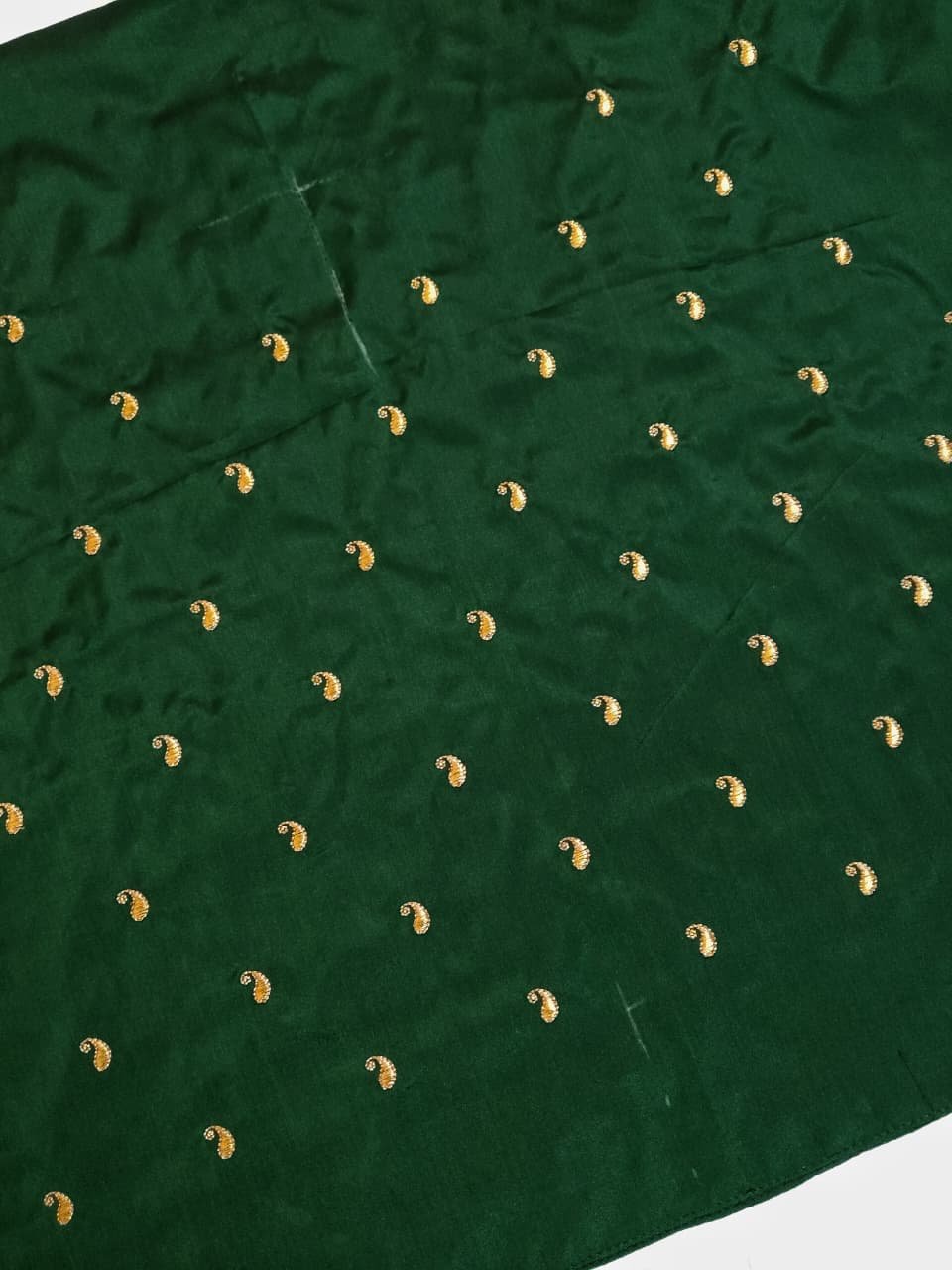 Bottle Green Color Fabric with Golden Zari Embroidery Work on Sleeves and simple buttas on the Back side