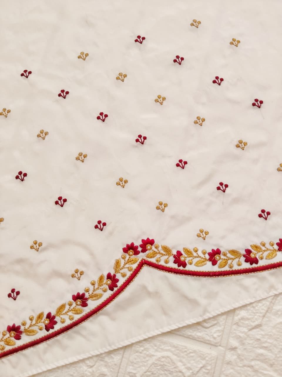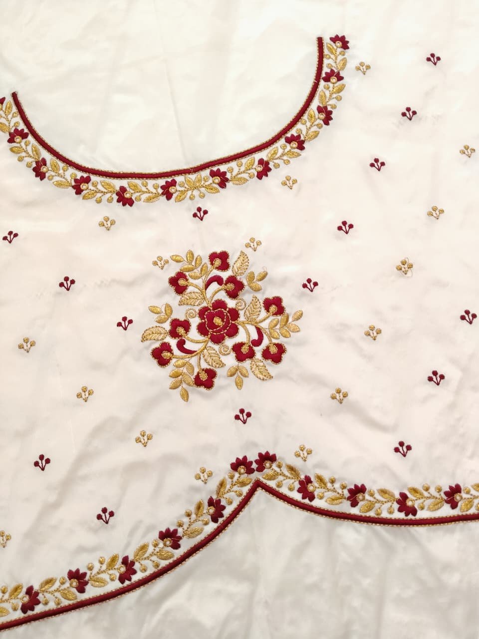 White Color Fabric with Marron and Golden Zari Embroidery Work