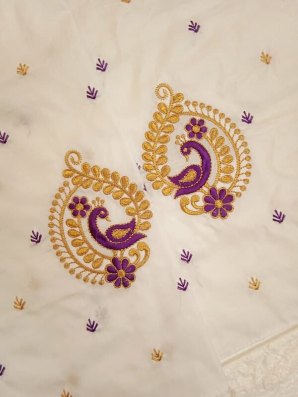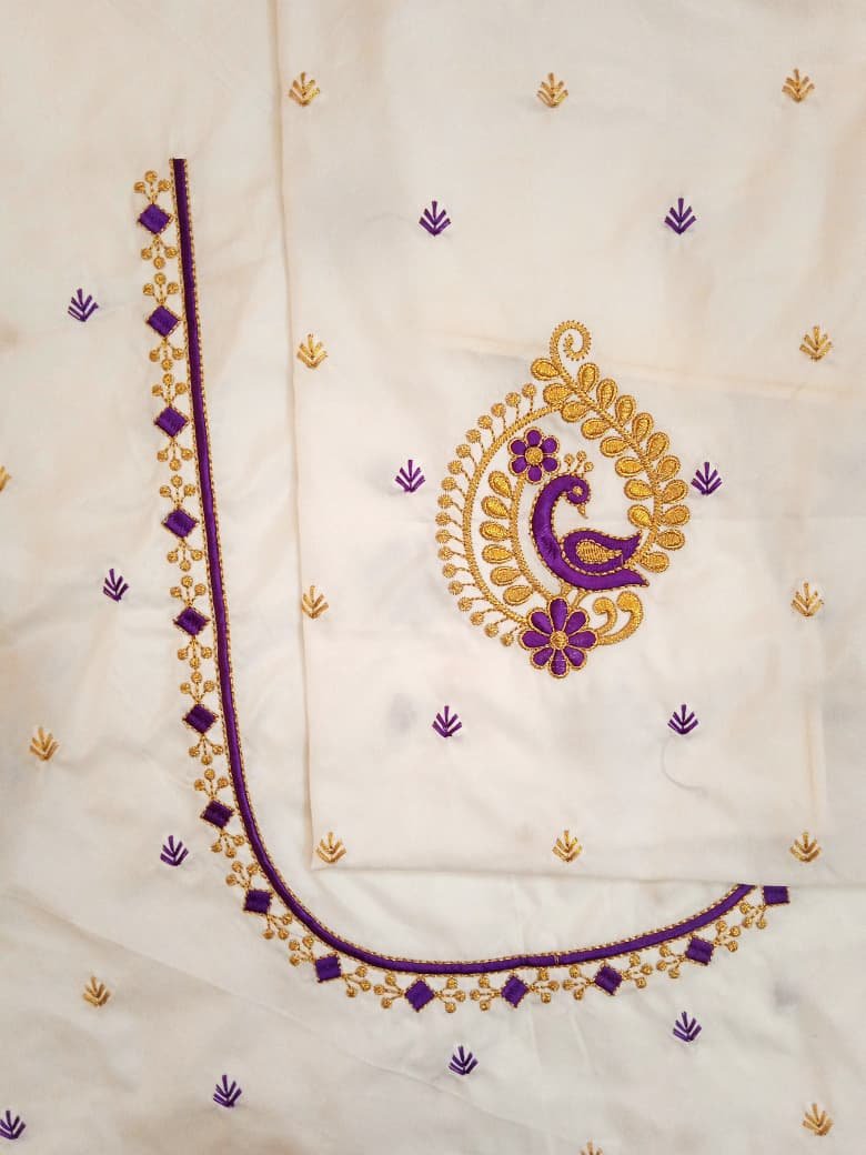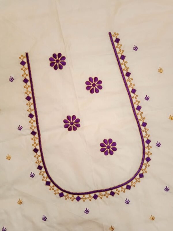 OffWhite Color Fabric with Purple silk thread and Gold Zari Embroidery Work