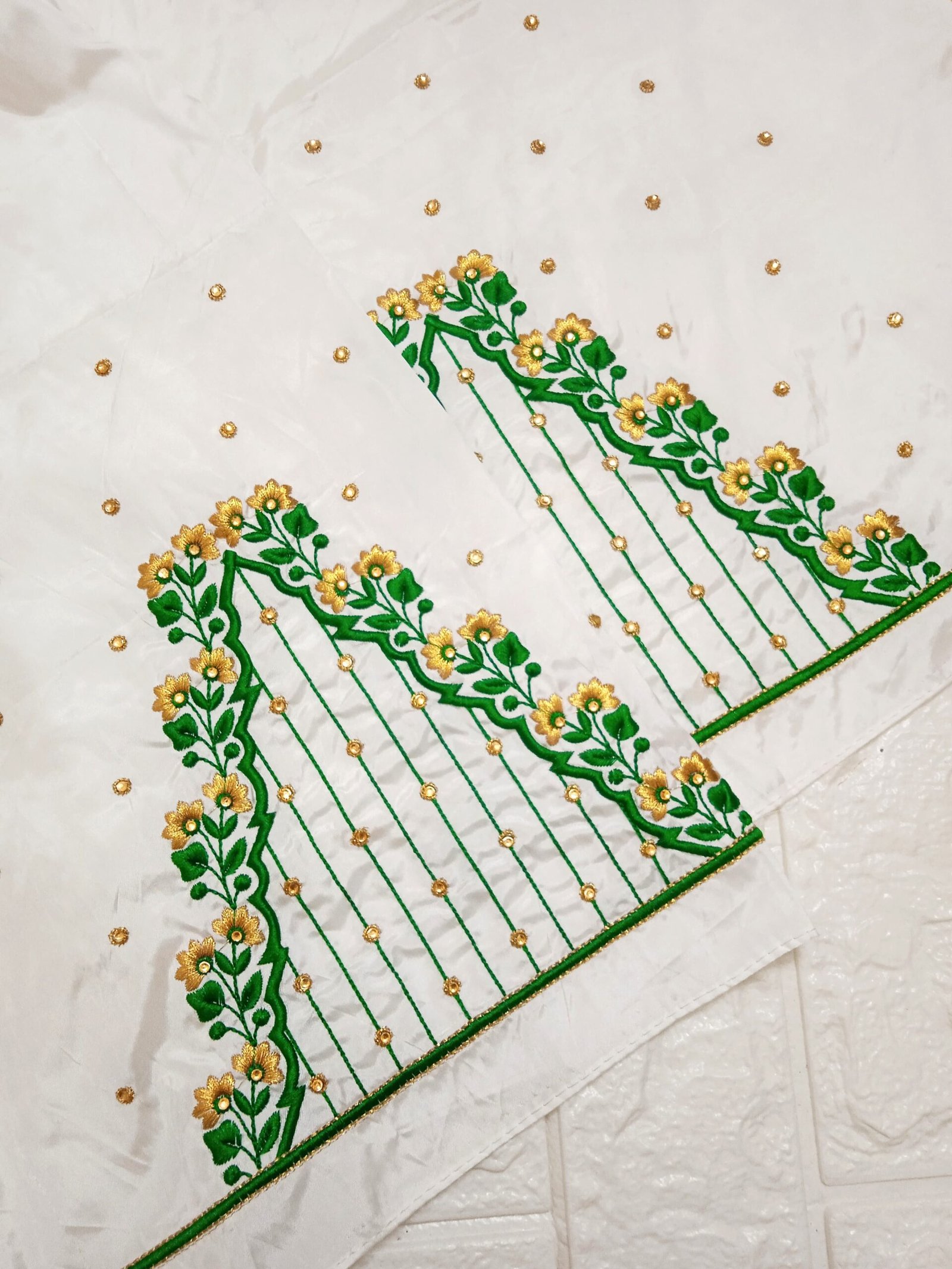 Off -White Color Fabric with  Green silk thread and Golden  Zari Embroidery Work