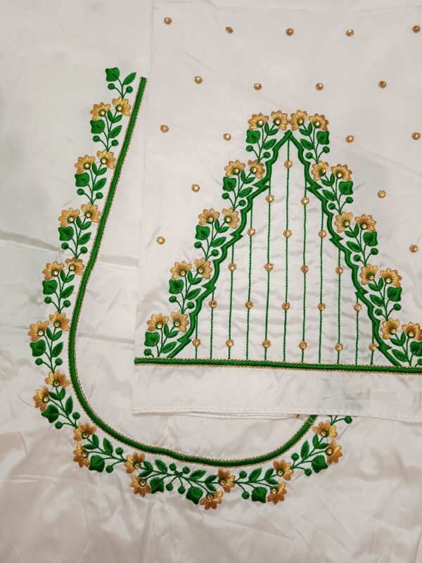 Off-White color Fabric with Green and Golden Zari thread Embroidery